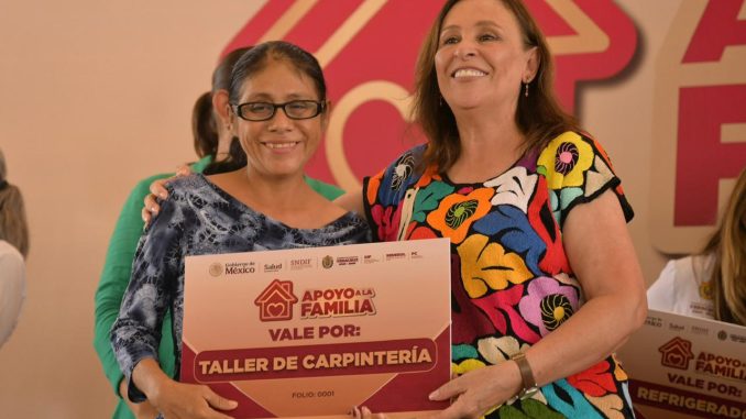 Los insumos entregados incluyen tinacos, láminas de zinc, refrigeradores, estufas ecológicas, talleres de carpintería, panadería y repostería, así como bastones, sillas de ruedas, lentes graduados y de vista cansada, andaderas y despensas alimentarias.