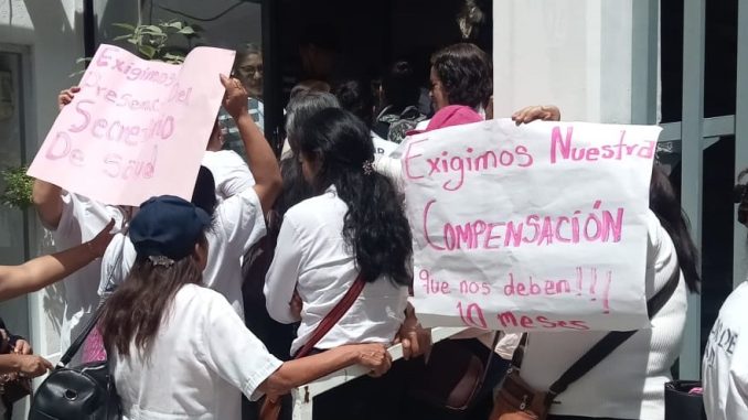 Irineo Pérez Melo.- Auxiliares de Salud comunitarias se manifestaron y tomaron las instalaciones de los Servicios de Salud de Veracruz (Sesver) para denunciar la falta de pago desde hace ocho meses, sin que las autoridades correspondientes les informen los motivos de dicha medida.