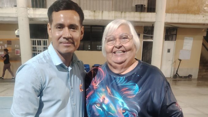En esta gráfica fue captada con el director de la Escuela de Bachilleres Pánuco Mtro. Mauro Castañón Cruz, en amena conversación recordando anécdotas diversas de cuando fue docente y subdirectora de este plantel educativo.