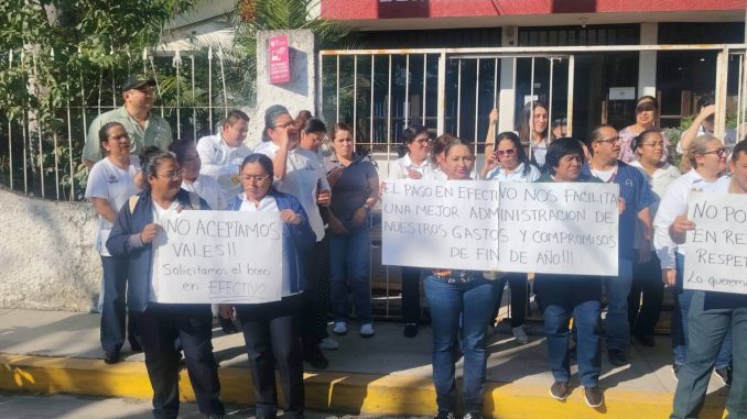 Este movimiento que también se realizó afuera del hospital civil Dr. Manuel I. Ávila fue por la misma causa, la inconformidad porque los quieren obligar a cobrar el bono navideño en vale con caducidad en 10 días y solo podrían comprar en tiendas comerciales impuestas por el gobierno.