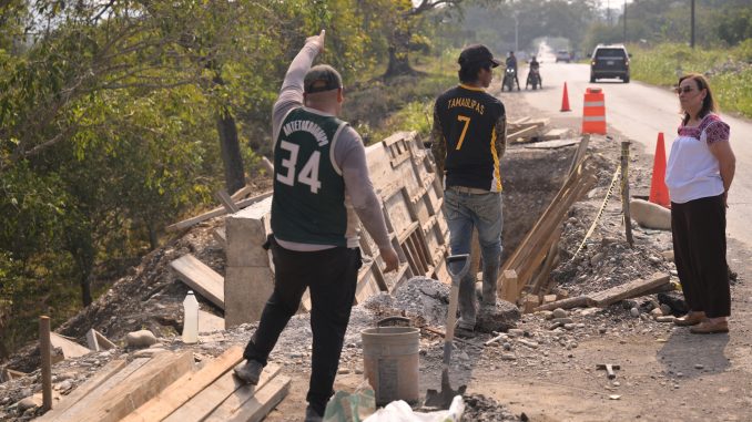 En Ixcatepec, instruyó a garantizar la calidad de la obra y el cumplimiento de los tiempos de ejecución para restablecer de manera segura la conectividad en un tramo afectado por una socavación provocada por las lluvias, al tratarse de una vía que conecta el entronque con la carretera federal.