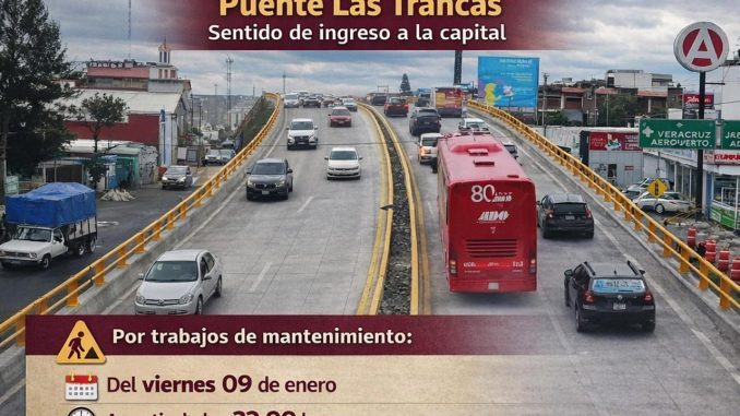 Xalapa, Ver., jueves 08 de enero de 2026.– La Secretaría de Infraestructura y Obras Públicas (SIOP) informa que, debido a trabajos de mantenimiento, se realizará el cierre del puente Las Trancas en el sentido de ingreso a la ciudad de Xalapa, a partir de las 22:00 horas de este viernes y hasta la mañana del domingo 11 de enero.