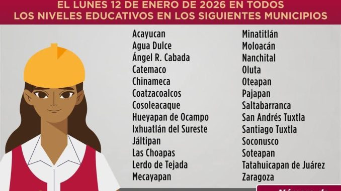 Xalapa, Ver., domingo 11 de enero de 2026.– El Comité Estatal de Emergencias, en coordinación con la Secretaría de Educación de Veracruz, determinó la suspensión de clases el lunes 12 de enero, en todos los niveles educativos, ante el pronóstico de lluvias significativas derivadas del Frente Frío 27, en 26 municipios del sur del estado.
