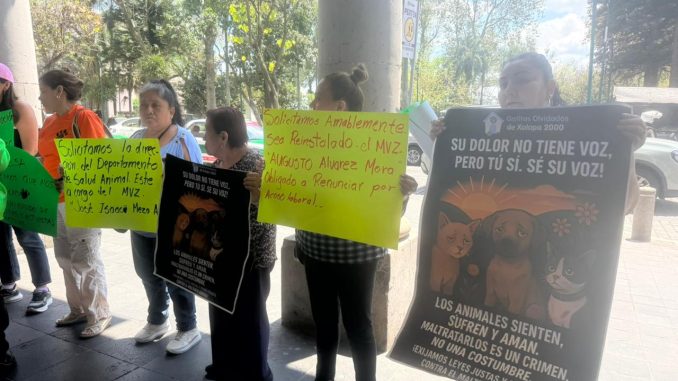 Irineo Pérez Melo.- Rescatistas y animalistas independientes se manifestaron en los bajos del palacio municipal para exigir la destitución de Vianet Martínez Cabrera, directora de Salud Animal y de Jonathan Grajales, Jefe del Departamento de Salud Animal del ayuntamiento de Xalapa, por omisiones en las que han incurrido en la ejecución de su trabajo y la desatención para con las organizaciones que se dedican al rescate de mascotas y animales en situación de calle o de riesgo.