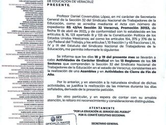 • Suspenden clases días 18 y 19 en el estado de Veracruz para realizar actividades sindicales. Irineo Pérez Melo.- Los agremiados de la Sección 32 […]